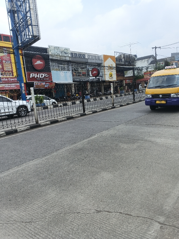 The image depicts a daytime street scene in what is identified as Candelaria, Philippines. The foreground features a multi-lane concrete roadway with visible expansion joints and a minor crack, transitioning to an asphalt surface closer to the left. A black and white striped curb separates the roadway from a black metal pedestrian barrier, which runs horizontally across the midground. Beyond the barrier, a row of multi-story commercial buildings lines the street. Prominent signage includes "PHD PIZZA HUT DELIVERY" displayed multiple times, "SAKURA TEXTILE," "Nasha Opera," and "Dhara Gallery." A large blue metal billboard structure is partially visible on the far left. Vehicles present include a white sedan, possibly a Honda Civic, partially visible on the left behind the barrier, and a yellow and purple Suzuki Carry van in the right foreground, moving towards the viewer. The van bears a license plate reading "F 1943 ZI" and has a yellow sign on its roof. Several motorcycles are parked in front of the shops behind the barrier. Indistinct individuals are visible on the sidewalk in front of the shops. The sky is overcast. Utility poles and wires are visible further down the street on the right.