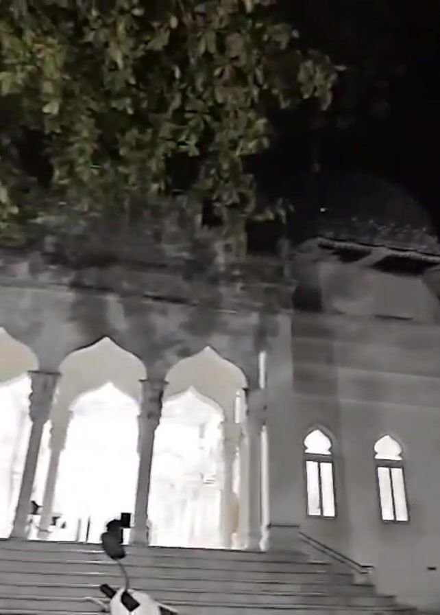 The video depicts a white mosque at night