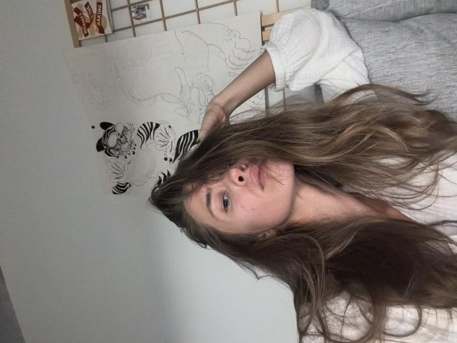 A young woman with long, wavy brown hair covers part of her face with one hand. She wears a white, collared shirt and reclines against a gray surface. In the background is a white wall decorated with black and white drawings of tigers and other flora. A screen or framed artwork with text in red and black sits above the tiger drawings. The composition is slightly angled.