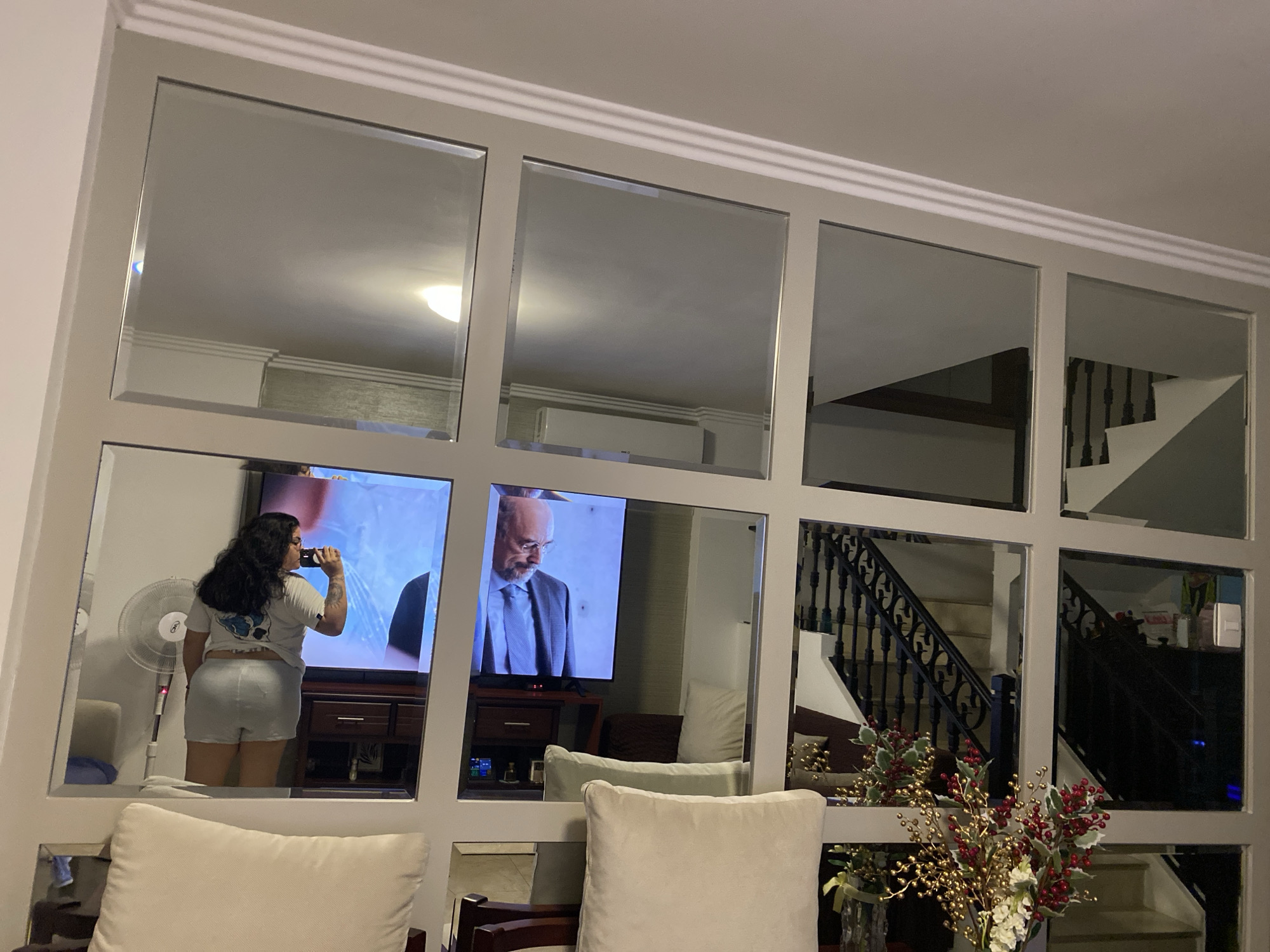 A residential interior is depicted, featuring a wall adorned with a grid of square mirrors. The mirrors reflect various aspects of the room, including a woman drinking from a container, a television displaying a man in a suit, a staircase with black railings, furniture (including white cushions), and a floor fan. A floral arrangement sits in front of the mirror wall. It is not possible to confirm that the location is La Aurora, Ecuador with the given information.
