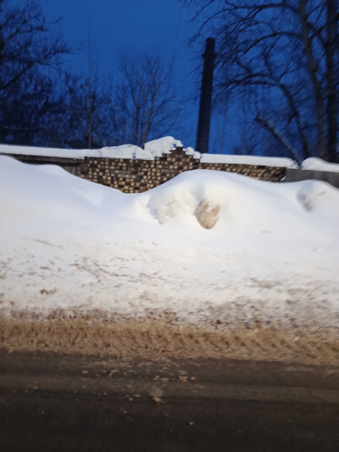 The image depicts an outdoor winter scene in Красный Маяк, Russia, under a dark blue, possibly twilight or nighttime, sky. In the foreground, a dark asphalt or paved surface is partially covered by a thin layer of dirty, brownish-white snow and ice with visible textural patterns. Immediately above this, a substantial, uneven mound of white snow stretches across the midground. Embedded within this snow mound, slightly right of center, is a distinct yellowish-brown, irregular patch of exposed material. Behind the snow mound, a low, flat-topped wall or barrier is visible, upon which a large quantity of chopped firewood logs is stacked neatly, partially covered by fresh snow. The background features silhouettes of numerous bare deciduous tree branches against the dark blue sky. A tall, slender, dark industrial chimney or smokestack stands vertically on the right side of the frame, rising above the treeline. No individuals, specific actions, or interactions are discernible.