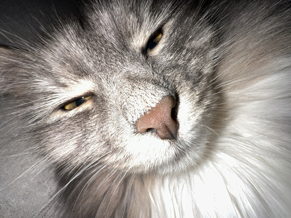 - "A close-up shot features a grey and white long-haired cat with golden eyes squinting slightly" by FM-3OYS02, licensed under CC BY 4.0