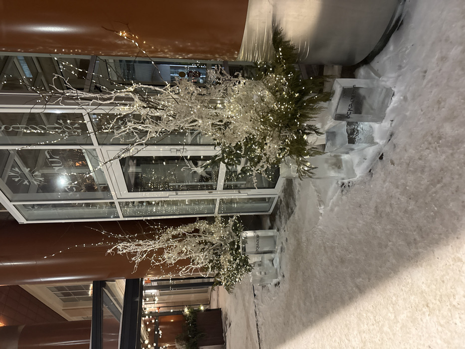 A building facade is adorned with winter decorations. Bare, white-lit branches and green foliage emerge from ice blocks arranged in a tiered fashion. The structure features large glass windows reflecting the surrounding scene. A snow-covered ground surrounds the decorations, extending away from the building. The scene is lit at night.
