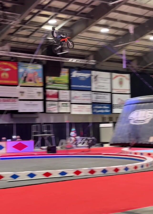 circus act involving a motorcycle flying through the air. The environment is an indoor arena or large event space with a high ceiling and multiple sponsor banners displayed on the wall. In the foreground is a circus ring with red carpeting and a diamond-patterned border. An inflatable landing pad with "406 FMX" printed on it is positioned behind the ring. Wires and rigging are visible above the landing pad, presumably used for the motorcycle stunt. At one point, a man in a blue suit and a red fez hat walks into frame, likely a circus performer or organizer. The sounds of the motorcycle and music are audible.