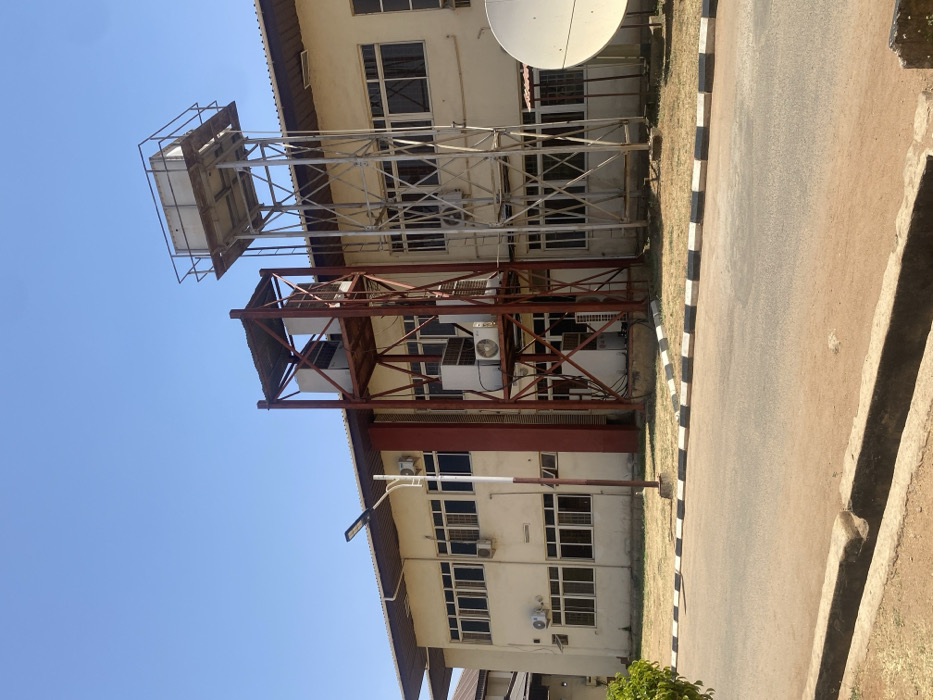 The scene depicts an outdoor view of a two-story building and associated infrastructure in Tudun Nupawa, Nigeria, under a clear blue sky