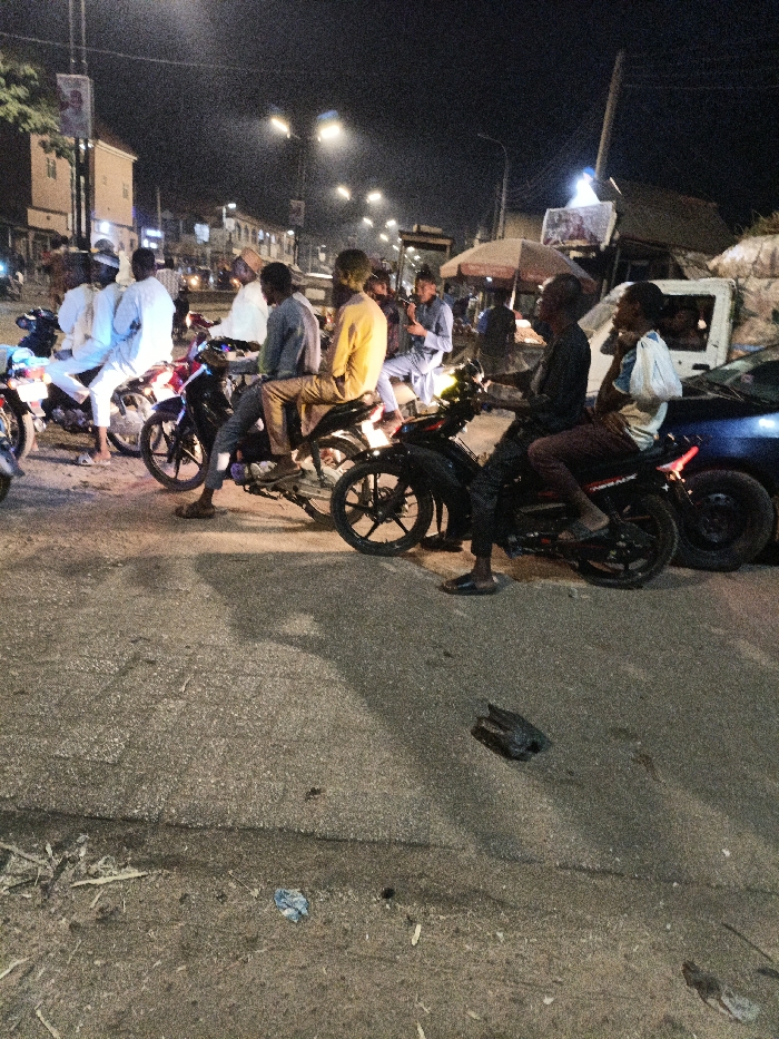 At night, a street is filled with people riding motorcycles. Some are wearing light-colored traditional clothing, while others wear casual attire. A van and a car are visible behind the bikes. The street is lit by streetlights, and a small pile of refuse sits on the ground. There appears to be a vendor stall setup in the background.