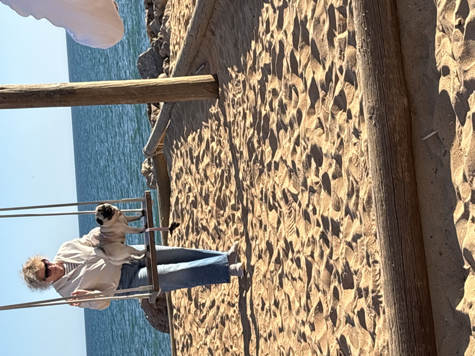 The image displays a sandy beach scene in Quarteira, Portugal, under bright, clear daylight. In the midground, an adult female with light, curly hair and sunglasses, dressed in a light-colored long-sleeved top and blue jeans, stands to the left of a wooden swing. She holds the swing's ropes with both hands. A light-fawn pug, with a dark muzzle, stands upright on the wooden swing seat, facing to the right. A pink leash or harness component is visible hanging from the dog's rear. To the right of the swing, a vertical wooden post and a horizontal wooden log are partially visible on the sand, likely forming part of the swing's support structure or other beach elements. The background consists of a clear blue ocean with a distinct horizon line under an unclouded sky. The foreground and midground are covered in light-colored sand, showing numerous footprints and textured undulations, with prominent shadows indicating direct sunlight. A large, dark wooden log rests horizontally in the lower foreground.
