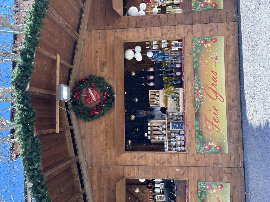 A wooden Christmas market stall, adorned with green garlands and a large wreath featuring a red heart, is depicted in the city of Lucca, Italy. A male vendor, wearing a blue beanie and a light-colored top, stands behind the counter within the open service window. The counter displays numerous small jars of pâté-like products, various bottles of wine and spirits, and multiple handwritten price tags. The stall's interior is decorated with golden baubles and white spherical lanterns, with a dark backdrop. A prominent banner along the lower front of the stall reads "Foie Gras" in red script, surrounded by festive ornaments. Above the stall, a clear blue sky is visible, along with bare tree branches and a section of a building with red roof tiles. The ground in front of the stall is a light grey, paved surface.