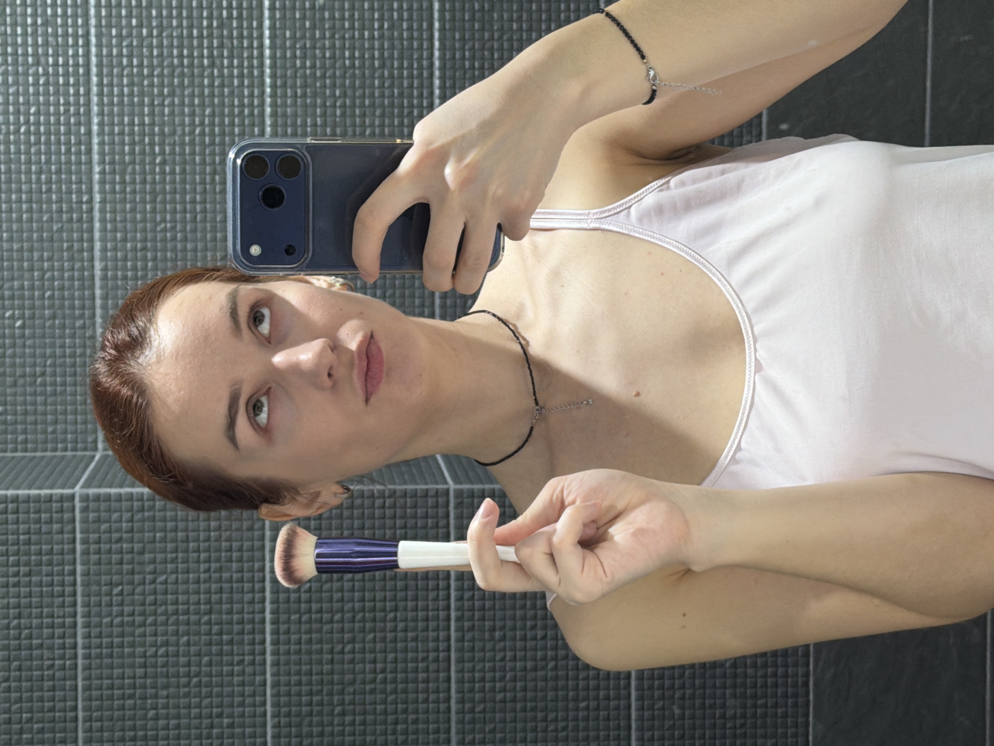 A female individual is depicted in what appears to be a bathroom or dressing area in Chaikovsky, Russia. The subject, with reddish-brown hair and fair skin, is seen from the chest up, positioned as if reflected in a mirror. She holds a dark blue smartphone with a clear protective case in her right hand, pointed towards herself, indicating a selfie. Her gaze is directed upwards and to her right. In her left hand, she holds a makeup brush vertically, featuring light-colored bristles and a handle that transitions from purple at the top to white at the bottom. She wears a light-colored, possibly pale pink or white, spaghetti-strap tank top. Accessories include a small silver hoop earring in her left ear, a thin black beaded choker necklace with a silver pendant, and a thin black beaded bracelet on her right wrist. The background consists of dark grey square tiles arranged in a grid pattern, with a visible vertical seam or corner behind her left shoulder.