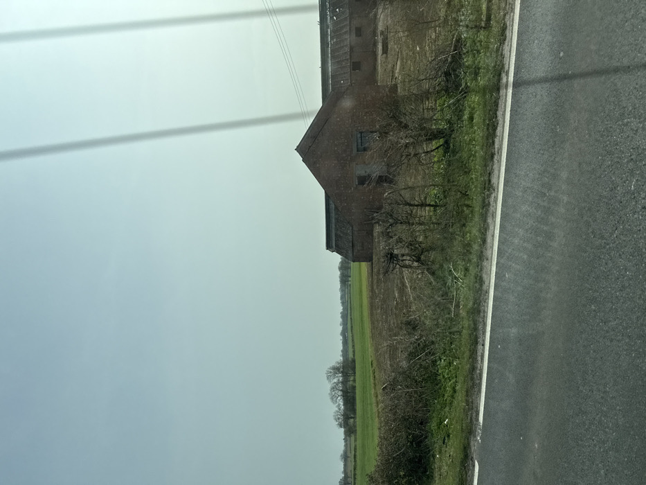 The image depicts a rural scene in Thorpe Waterville, United Kingdom, viewed through a window exhibiting several vertical linear obstructions or reflections. The foreground features a dark asphalt road with a white edge line, bordered by a strip of green grass and brown, bare shrubs and small trees. Beyond this vegetation, agricultural land is visible, comprising a section of tilled brown earth and an expanse of green field. To the right, a complex of red brick agricultural buildings is present. The most prominent structure has a pitched roof and two rectangular openings, possibly doors or windows, on its visible facade. A longer, lower brick building with a similar roofline extends behind it to the right. Three dark, horizontal power lines are situated above these buildings. The background reveals further fields and a distant line of deciduous trees lacking foliage, silhouetted against a pale, hazy blue-grey sky. No individuals, animals, or active subjects are depicted.