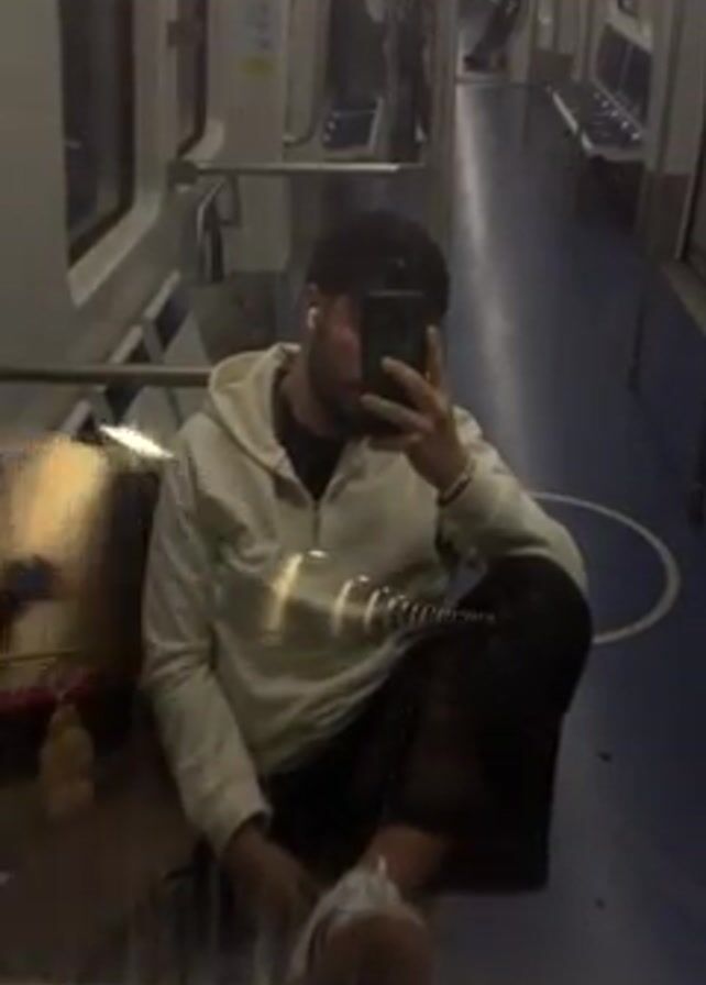 man sitting on the floor of a subway car, taking a selfie with his phone