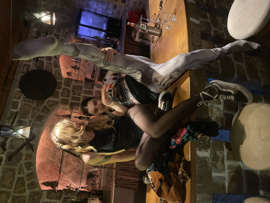 A person with long blond hair is lying on a counter with a person in leggings and sneakers performing a split on top of them. Behind the two are wine bottles and glasses. The area has a stone wall backdrop and a lit-up stone fireplace. There is a TV or monitor in the background, too.