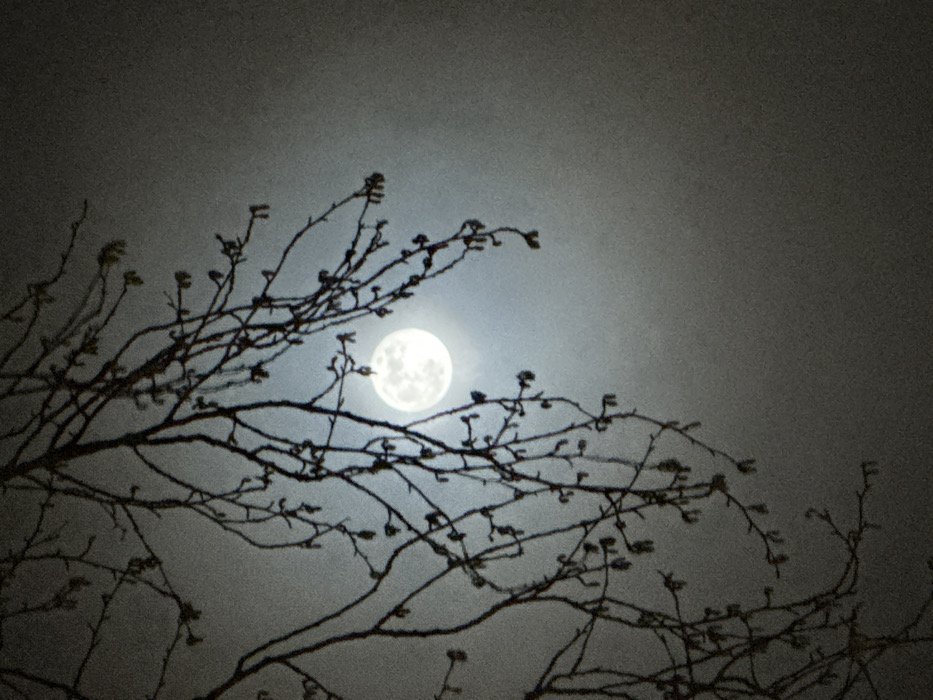The image depicts a night-time outdoor scene in Gorleston-on-Sea, United Kingdom. A prominent, circular, bright white full moon is visible in the upper-right quadrant of the frame, emitting a diffuse glow. Dark, silhouetted tree branches extend into the frame from the left, top, and partially from the right, obscuring portions of the moon and background sky. These branches appear largely bare, displaying numerous small, dark, elongated structures consistent with dormant buds or catkins. The sky is a uniform dark grey, indicating night conditions with atmospheric haze or cloud cover. No individuals, man-made structures, or specific ground features are discernible within the frame. The scene is static, focusing on the celestial body and natural arboreal elements.