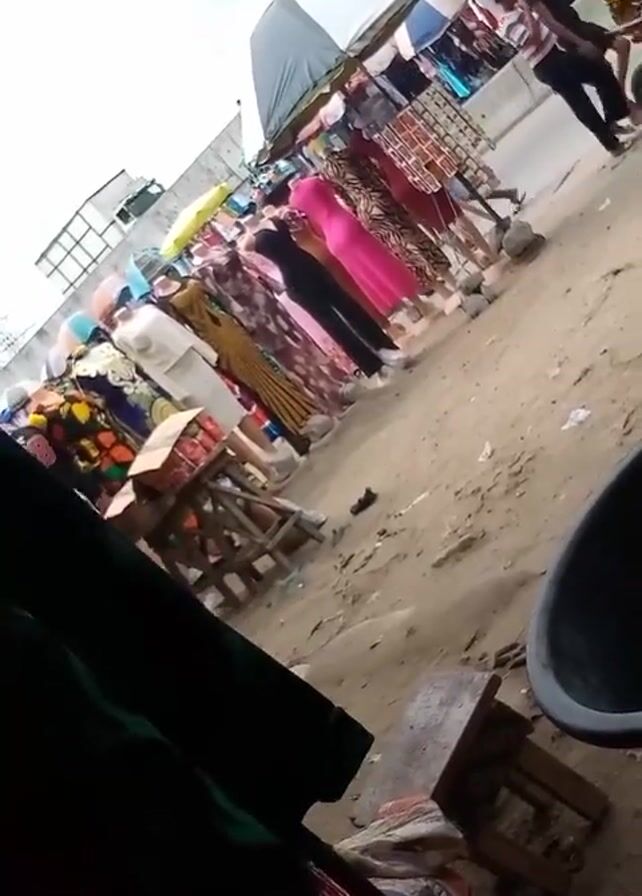 The scene shows an outdoor market with clothing displayed on mannequins. The mannequins are lined up in a row, each dressed in different outfits under umbrellas. People are walking past the displays, some pulling carts. The ground appears to be a mixture of dirt and pavement. In the foreground, there is a large black tub and a stool. Part of a colorful fabric is also visible in the lower left corner of the frame.