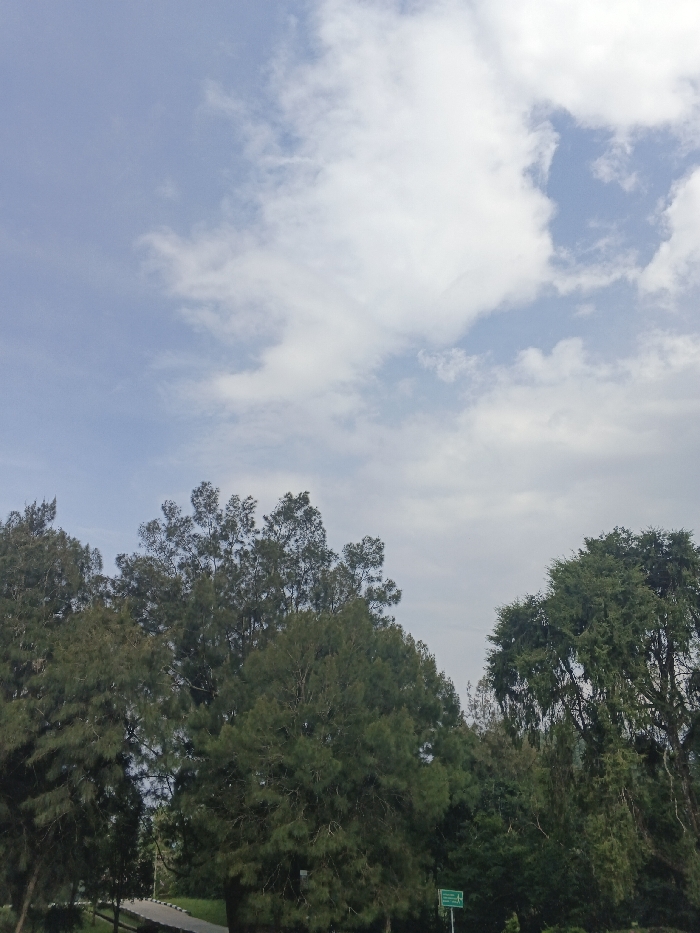 The scene depicts a daylight outdoor environment in Tapaiteng Uesa, Bhutan, characterized by a partly cloudy sky above a dense line of evergreen trees. The upper two-thirds of the image show a light blue sky with scattered white and light gray cumulus clouds. The lower third is dominated by dark green coniferous trees of varying heights, forming a natural barrier across the horizon. A segment of a dark gray paved road or pathway is visible on the lower left, curving slightly upwards. A small, rectangular green road sign with white, illegible text is partially visible through the foliage in the lower right quadrant. No individuals, animals, or active interactions are present in the frame.