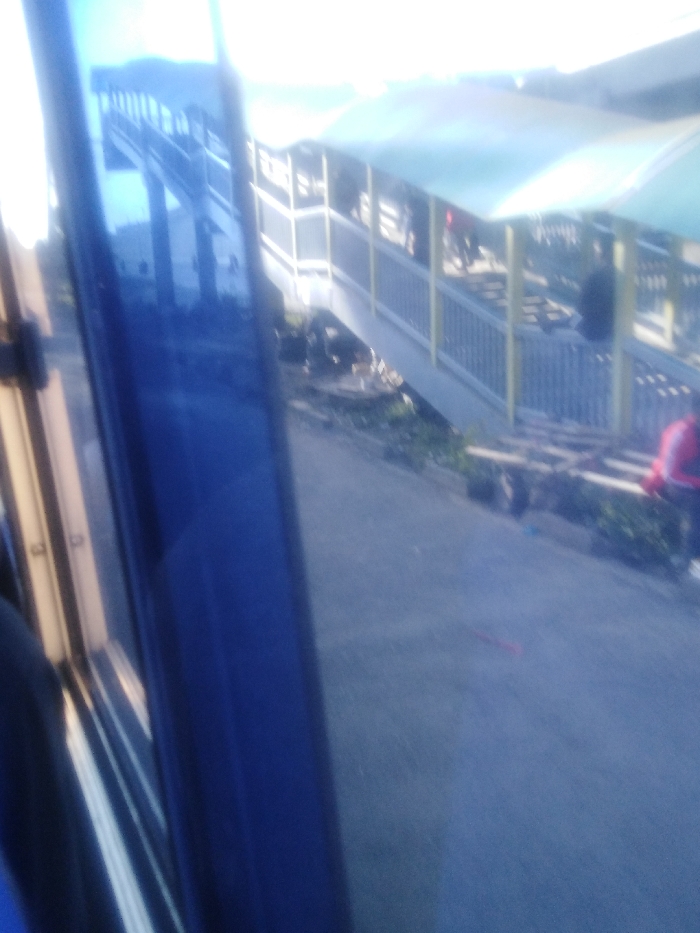 A partial view through a blue-tinted window shows an exterior scene. In the background, a pedestrian overpass is visible with a light-colored structure and a green roof. People are walking on it. Below, potted plants are arranged along the ground. A person in a red jacket sits near the railing. The rest of the frame is dominated by the blue window, obscuring details and creating a blurry effect.
