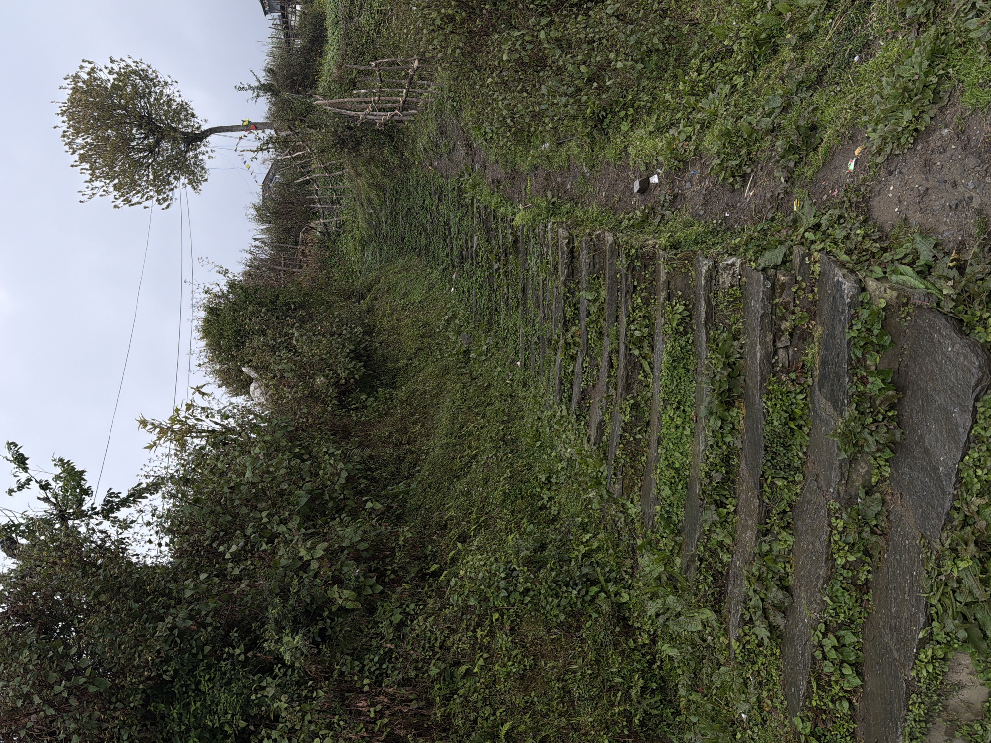 The image displays an upward-sloping view of a stone staircase and an adjacent dirt path within the city of Ghandruk, Nepal, under an overcast sky. The central stone staircase, constructed from irregular, dark-colored slabs, is significantly overgrown with various small green plants and moss, indicating age or limited maintenance. The steps appear damp. To the right of the staircase, a narrower dirt path, muddy and uneven, ascends parallel, containing scattered small pieces of debris, including wrappers. Dense green vegetation, consisting of shrubs and smaller plants, covers the sloped ground on both sides of the path and staircase. Taller, leafy shrubs and trees line the left side, obscuring the immediate horizon. On the upper right, a slender, medium-sized tree with sparse foliage stands against the pale gray, featureless sky. Multiple thin, dark power lines traverse the upper frame horizontally, passing near this tree. Prayer flags of various colors are attached to the tree's trunk. Further along the ascent, a rustic wooden fence constructed from bound sticks is visible on the right. Beyond the fence and surrounding vegetation, partial views of distant structures, likely buildings with dark roofs, suggest a residential area. No individuals are present in the scene.