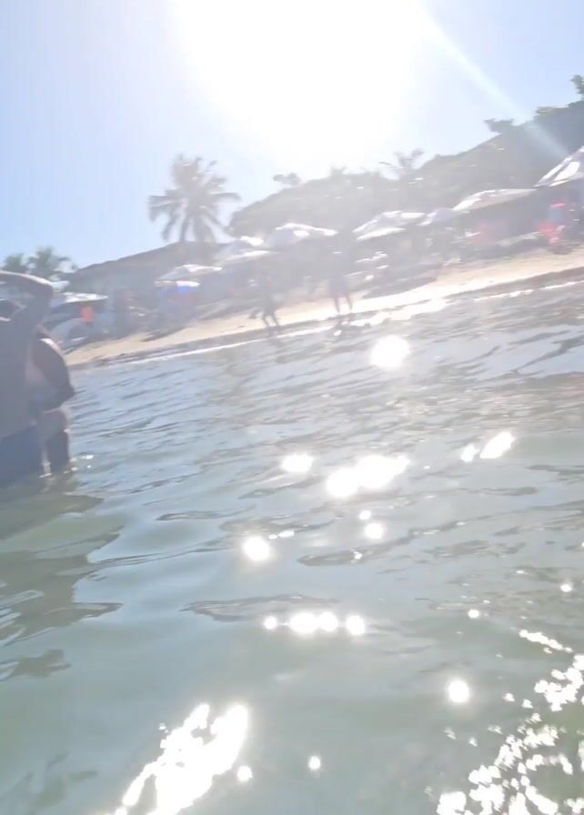 someone getting out of ocean water at a beach. The water is clear enough to see some bubbles. The video starts facing out towards the water, with some land and hills in the distance. Then the camera tilts up to show a woman with wet hair emerging from the water. The camera briefly dips back into the water, looking towards the beach, before rising to show the beach with people. The camera then dips back into the water.