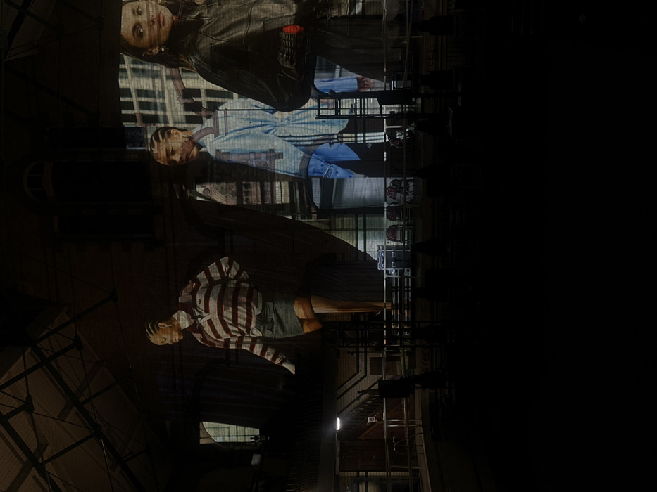 The image captures a large-scale projection display within a dimly lit, high-ceilinged historic event hall in Manchester, United Kingdom. The hall features exposed dark metal trusses and arched brickwork in the ceiling and upper walls, with arched windows visible in the background. Three distinct digital projections of female models are displayed prominently on a large surface. The leftmost projected model, positioned slightly to the viewer's left, features braided hair and is dressed in a red and white striped polo shirt with an Adidas logo, paired with a grey mini-skirt. Her right leg is partially visible. The central projected model, also with braided hair, faces forward wearing a light blue jacket or top. The rightmost projected model, with dark hair, faces forward wearing a dark, possibly leather, jacket. Both the central and rightmost models have projected urban brick building facades as part of their backgrounds. In the lower mid-ground, a metal railing stretches horizontally, delineating a raised platform or mezzanine level. Below the main projections, on a lower, darker floor, several red and white chairs are arranged in rows, indicative of audience seating. To the left of the chairs, some event equipment, possibly a speaker, stands on a support. Further left, a lighted doorway and a staircase are visible, suggesting an access point. The foreground of the image is largely obscured by shadow.