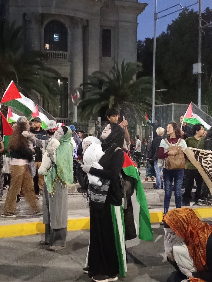 The image captures a nighttime public gathering or protest on a street or plaza directly in front of the Palacio de La Moneda in Santiago, Chile. The neoclassical facade of the presidential palace, with its columns and arched windows, is visible in the background, partially obscured by palm trees. In the center foreground, a woman wearing a black hijab and long dark clothing holds a baby wrapped in white cloth, with a Palestinian flag draped over her left shoulder. She is looking upwards. Immediately to her left, another woman, wearing a light green head covering and a long gray garment, also holds a baby wrapped in white and looks upwards. Multiple Palestinian flags, characterized by horizontal black, white, and green stripes with a red triangle, are prominently displayed throughout the crowd by various participants. A young man to the right of the central figures is holding a smartphone aloft, pointing it upwards, possibly recording or photographing. To the far right, partially visible, another individual wearing an orange-patterned head covering is hunched over, with their hands near their face. The ground is an asphalt surface with a distinct yellow painted curb in the lower frame. The overall scene indicates a demonstration of solidarity, likely in support of Palestine, occurring during dusk or nighttime hours.
