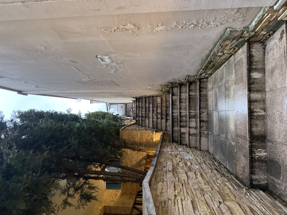The image depicts an outdoor, ascending staircase in Varna, Bulgaria. The staircase is constructed from dark grey, rectangular tiles, appearing wet and exhibiting discoloration, possibly from moisture and accumulated grime on the risers and treads. It rises steeply, terminating at a visible black wrought-iron gate. To the left of the staircase, a retaining wall or building facade is clad with light brown, stacked stone veneer. Behind this wall, a dense line of tall, dark green coniferous trees (likely cypress or thuja) grows vertically, partially obscuring a building. Portions of this building, also featuring stone veneer and a wooden balcony railing, are visible, illuminated by warm artificial light. To the right of the staircase, a tall, light beige-colored wall runs parallel to the ascent. This wall exhibits significant deterioration, including large patches of peeling paint or stucco, surface bubbling, and dark stains, particularly along its base. The bottom edge of this wall is bordered by a strip of stacked stone veneer, similar in color to the stone on the left. The sky above is overcast and pale grey. The damp appearance of all horizontal surfaces suggests recent precipitation. The scene is devoid of human presence or active subjects.
