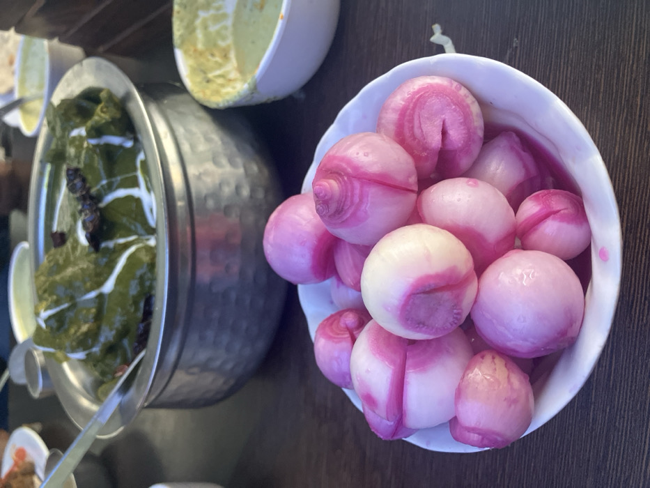 A close-up, elevated view captures a dining table laden with North Indian cuisine, consistent with a restaurant setting in Gurgaon, India. In the immediate foreground, a white, scalloped-edge bowl holds approximately twenty small, peeled, round onions, distinctive with their white flesh and vibrant pink-purple marbling, suggesting pickling or a beetroot infusion. Behind this, centrally positioned, is a large, hammered stainless steel serving bowl containing a generous portion of dark green, thick Saag, garnished with several white cream drizzles and three small, dark, dried chili peppers. A silver spoon rests within the Saag. To the right, partially visible, is a smaller white bowl containing a light green, textured chutney. To the far left, a portion of a white plate with reddish-brown food is visible. The various dishes are arranged on a dark brown table surface. No individuals are depicted, but the scene suggests a meal in progress or prepared for consumption.