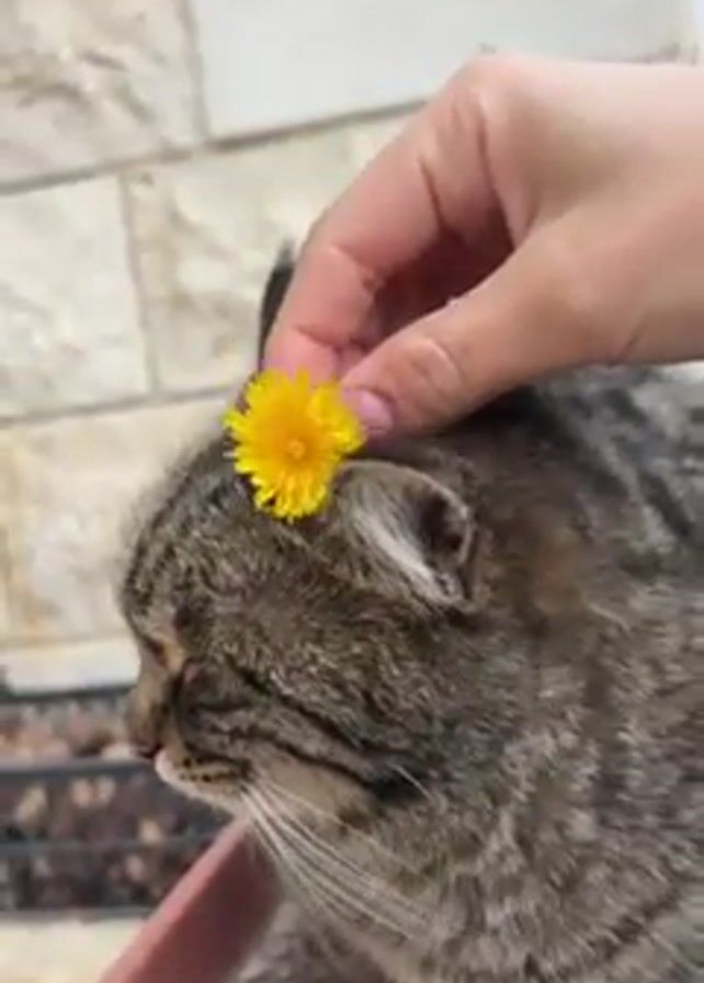 A hand places a small yellow dandelion flower on the head of a tabby cat