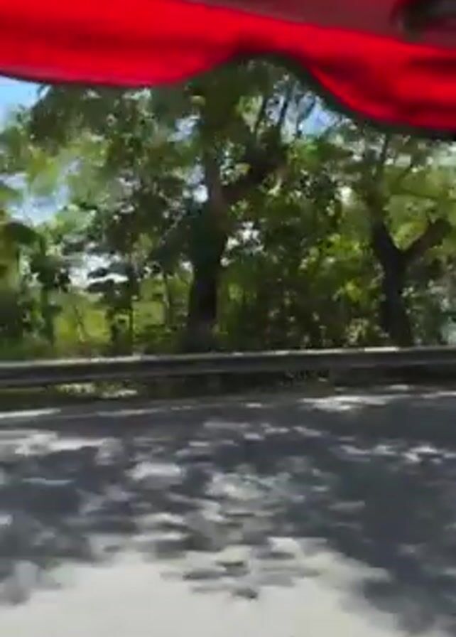 The video appears to be shot from inside a vehicle with a red roof. The camera is focused on the road passing by, with trees and greenery visible beyond a silver guardrail. The road is gray asphalt and has shadows of trees falling on it. The sky is partly visible through the trees.