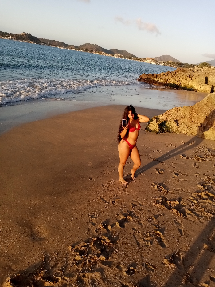 On a sandy beach next to water, a woman with long dark hair and a red bathing suit takes a picture with her phone. Light reflects off the wet sand near the ocean waves. Rocky formations are to the right of the woman, and mountains are in the distance. The sky is light blue with one small cloud. Footprints are in the sand in the foreground.