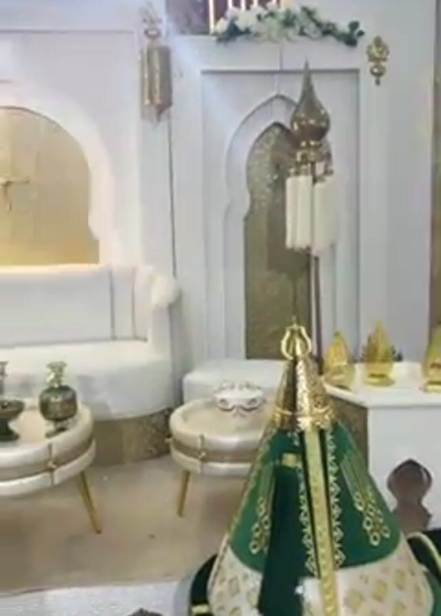 room decorated for a Moroccan wedding. The room is decorated in white, gold, and green. There is a white sofa, a small white table with green vases, and two green and gold covered chairs. The walls are white with gold accents, and there are white flowers on top of one of the walls. The floor is red. The camera pans around the room showing the details of the decor.