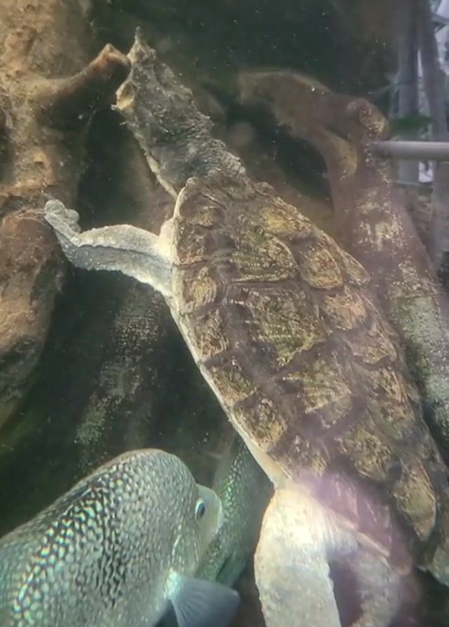 turtle and a fish in a tank. The turtle is large and has a patterned shell. It is positioned on its side, leaning against a rock or other object. The fish is silver and has black spots. It is swimming near the turtle. The tank appears to be slightly murky.