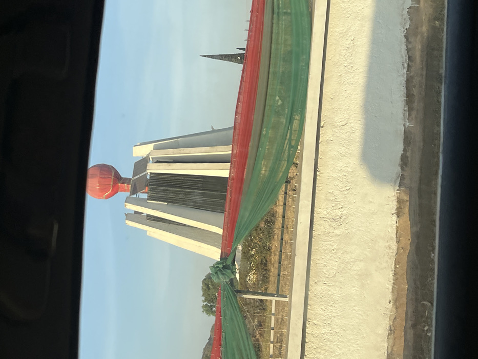 A distant monument featuring a red globe atop a structure with vertical slabs and white pillars is partially visible through a car window. Red and green fabric hangs along a roadside barrier. The background features sparse vegetation under a clear sky. A smaller, triangular structure is also visible on the horizon.