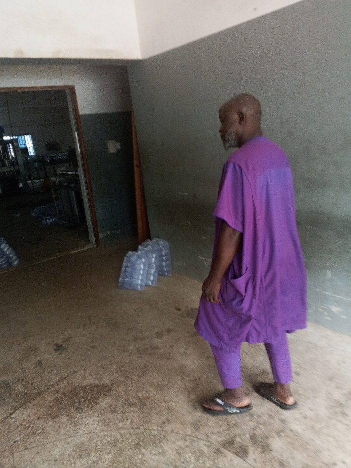 In Otokiti, Nigeria, an adult male stands on a stained concrete floor within an indoor environment. The individual, who is bald with a grey beard, wears a purple tunic with pockets, matching purple trousers, and black flip-flops. He is positioned facing slightly left, looking towards an open doorway on the left side of the frame. The walls of the room are painted two-tone, with a grey lower section and an off-white upper section. Through the open doorway, an adjacent room is visible, containing industrial-style machinery and stacks of clear plastic bags filled with water sachets or bottles. Several identical bags are stacked on the concrete floor near the doorway in the foreground. The man is stationary, observing the room through the doorway, with no apparent interactions or specific actions.
