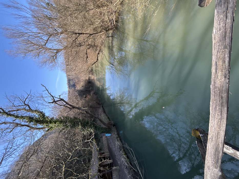 The image displays a river scene in Petrevene, Bulgaria, viewed from a slightly elevated position, likely a bridge. A weathered wooden railing, part of a structural barrier, is present across the bottom foreground. The river, characterized by greenish-blue water, flows from the foreground into the mid-distance, reflecting the clear blue sky and the surrounding bare tree branches. Sunlight casts distinct ripple patterns and reflections on the water's surface, with a small, light-colored piece of debris floating near the center-left. On the left bank, a dense line of bare deciduous trees and shrubs borders the water. A prominent tree, heavily entwined with green ivy, stands near the river's edge. Further inland and to the left, an open-sided pavilion-like structure with a dark roof and visible support pillars is situated on a dirt or gravel path running parallel to the river. A light blue cylindrical receptacle is visible on the riverbank, between the path and the water, slightly to the left of the ivy-covered tree. Behind the left bank, a steep, rocky hillside covered with bare trees rises sharply. The right bank is densely covered with bare deciduous trees and shrubs, extending upwards on a gentler slope away from the river. In the background, rolling hills with sparse vegetation define the landscape on both sides of the river. The sky above is clear and uniformly blue. No human or animal subjects are visible within the frame. The overall environment suggests a natural setting during a late autumn, winter, or early spring season.