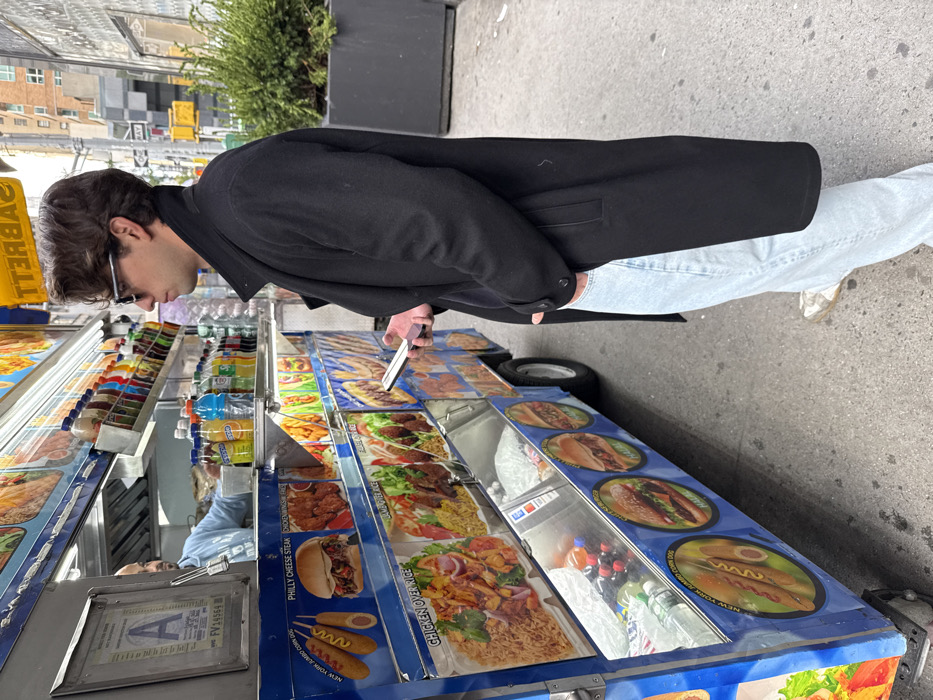 - "A male customer is observed standing next to a blue street food cart on a city sidewalk in New York, United States" by FM-sXyG72, licensed under CC BY 4.0