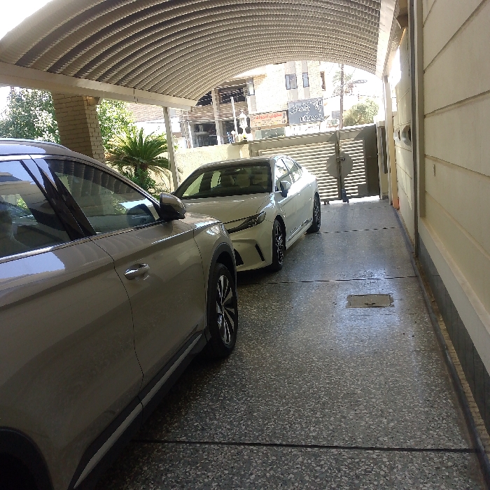 The image displays a static daytime scene within a partially covered parking area or private driveway in an urban setting
