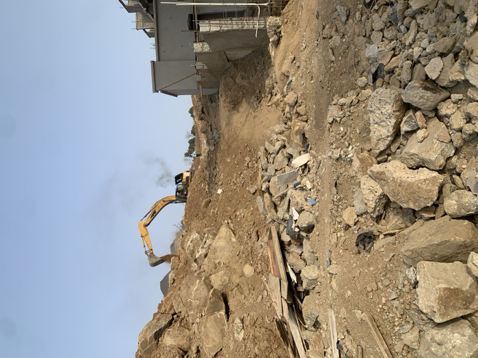 A yellow excavator is positioned on a rocky hillside amidst construction debris and large boulders. In the background, a multi-story building under construction stands adjacent to the excavation site. Smoke rises from the excavator, indicating recent or ongoing operation. The surrounding landscape is a mix of bare earth and rocky terrain under a pale blue sky.