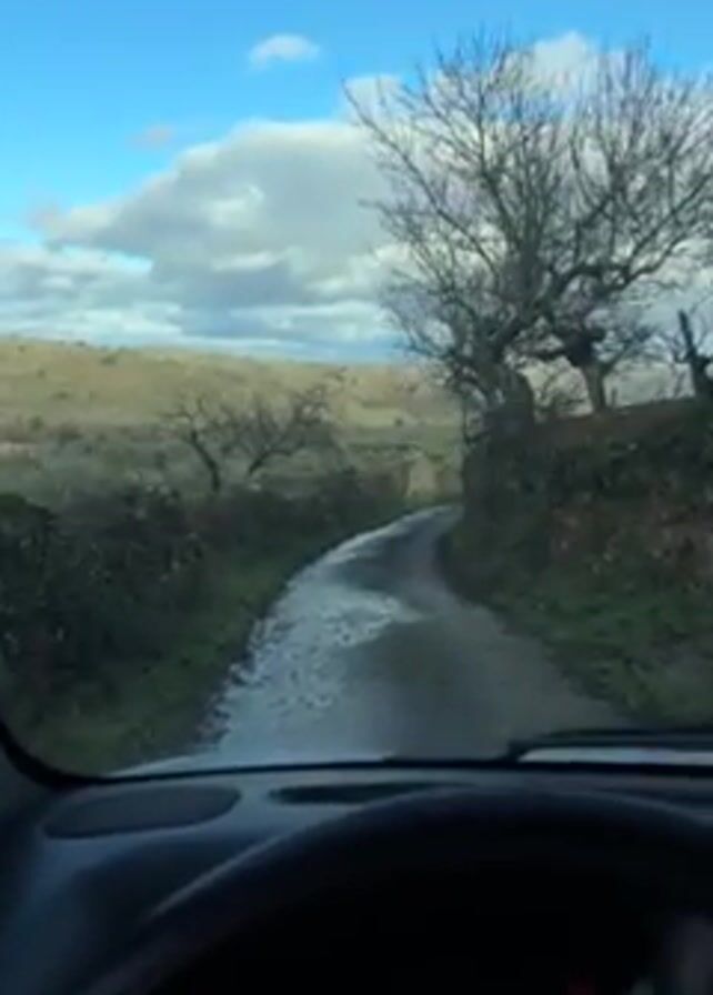 first-person perspective from inside a car, driving on a narrow, paved road. The road is wet, likely from recent rain, and surrounded by low stone walls on both sides. The landscape is rural, with fields and sparse trees visible in the background. The sky is blue with scattered white clouds. The steering wheel of the car is visible in the foreground, and a hand can be seen briefly touching it.