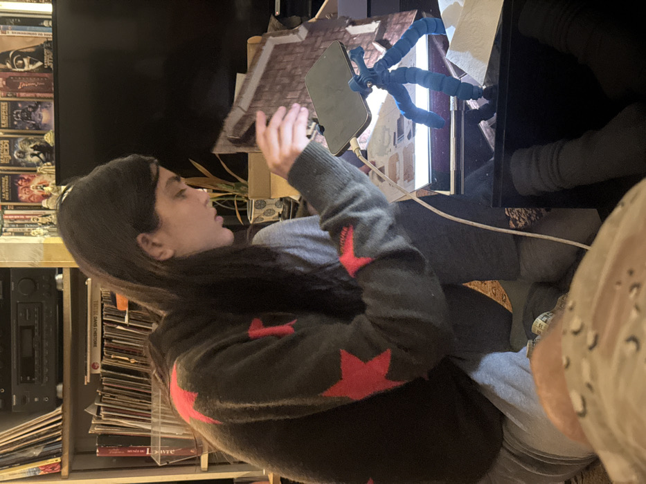 A woman with long dark hair is looking at a phone held in a blue flexible tripod stand. She is wearing a dark sweater with large red stars. The phone is in front of a backdrop resembling a building facade. In the background, there is a TV and a bookshelf with books and DVDs. The environment looks cluttered and indoors.
