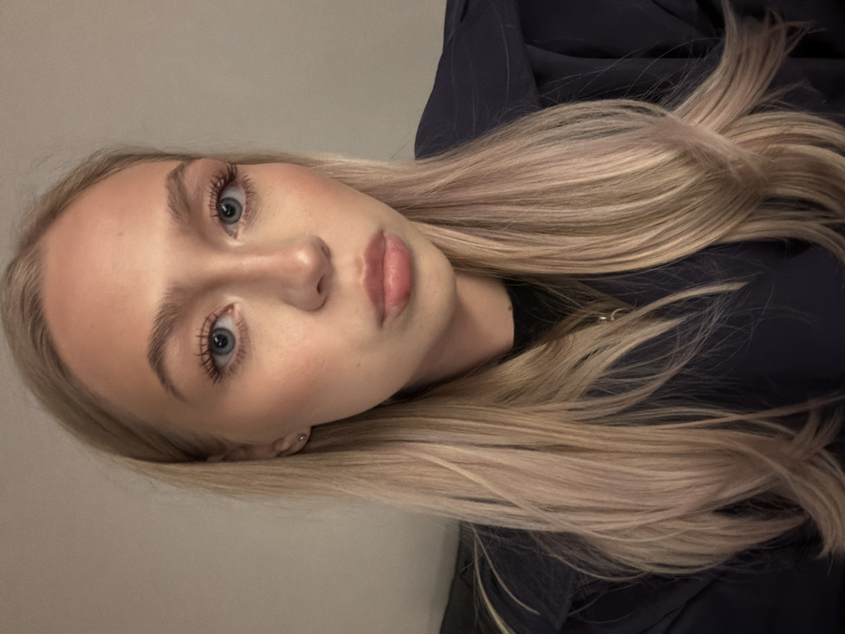 The image displays a close-up portrait of a young adult female in an indoor setting. She has long, straight, light blonde hair parted in the middle, extending past her shoulders. Her eyes are blue, and her complexion is fair, with visible light makeup, including mascara. A small, circular metallic stud earring is present in her left earlobe. She is dressed in a dark-colored garment, possibly a jacket or coat, over a black top, and a silver-toned necklace with a crescent moon pendant is visible around her neck. The subject is looking directly into the camera with a neutral expression, her lips slightly pursed. The immediate environment consists of a plain, light beige or off-white wall in the background. A dark, possibly upholstered surface is partially visible behind her left shoulder. No specific identifying features or landmarks are present in the image to determine a precise location within the city of Saint Petersburg, Russia.