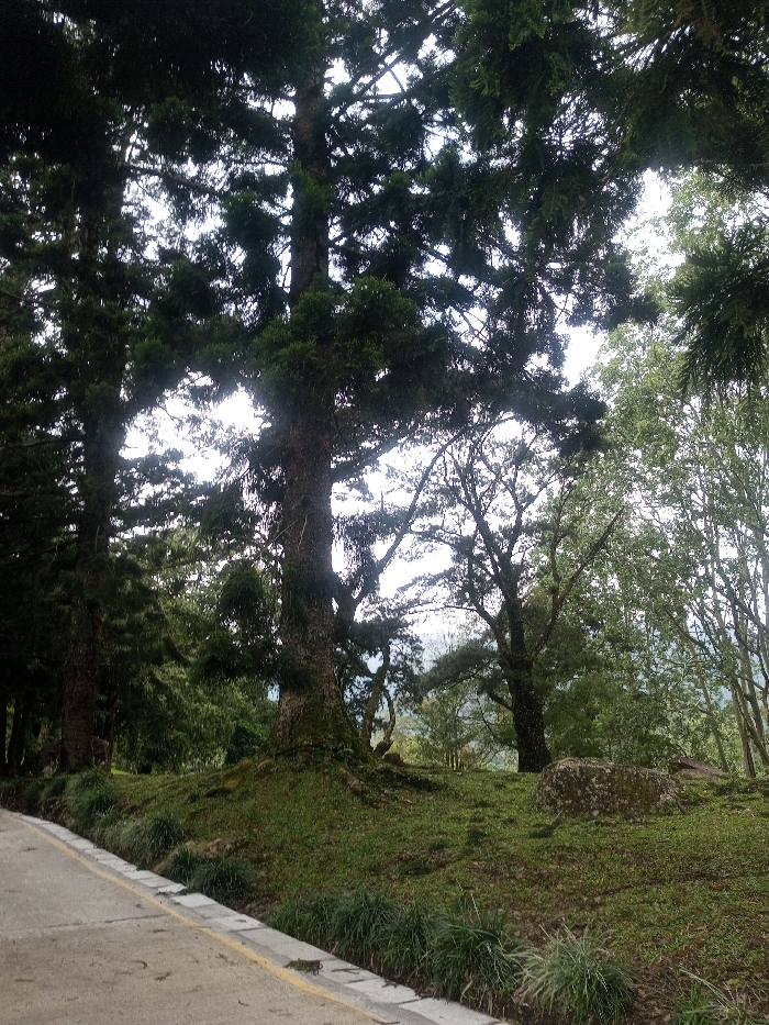 This image depicts a natural outdoor environment in Padegaon, India. The lower-left portion of the frame shows a concrete road or path, bordered by a raised concrete curb with a faded yellow stripe along its upper edge. Adjacent to the curb, a strip of dense, short green grass and small plants lines the roadside. To the right of the road, a grassy slope rises, covered in varying shades of green vegetation and some exposed soil patches. Several tall, dark-barked trees with dense, dark green foliage dominate the central and left portions of the image, their thick trunks appearing to be covered in moss or other epiphytes. Further up the slope, a large, moss-covered rock or boulder is situated on the grass towards the right. Additional trees with lighter green leaves are visible in the background, contributing to a dense canopy. The sky, partially visible through the tree branches, appears bright or overcast. No individuals or explicit actions are discernible within the scene.