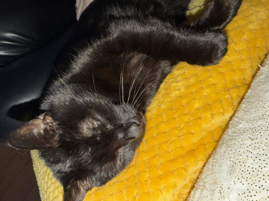 A black domestic cat is observed resting within an indoor setting in the city of Nice, France. The cat is positioned on its left side, with its eyes closed, indicating a state of sleep or repose. Its fur is short and uniformly black. White whiskers protrude from its muzzle. The inner aspect of the cat's right ear exhibits slight irregularities or discolored patches. The animal's body rests primarily on a bright yellow, plush fabric, characterized by a distinct quilted or ribbed texture. A segment of a lighter-colored, possibly white or cream, patterned fabric with a regular dotted texture is visible diagonally below the yellow material in the lower left portion of the frame. The background to the right and above the cat consists of an indistinct, dark surface, consistent with a shadowed piece of furniture.