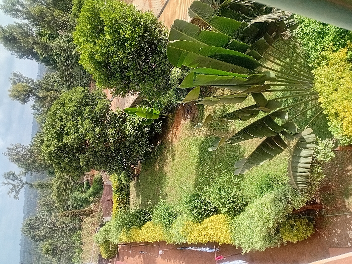 Lush greenery dominates the landscape, featuring tall trees, bushes, and grass. A fan-shaped plant with large leaves stands out. A row of colorful shrubs lines a building, with clotheslines visible below. The scene conveys a sense of natural abundance and peacefulness.