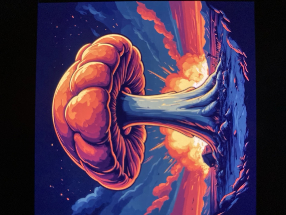 - "A surreal illustration features a large, bulbous orange form resembling a brain or fleshy doughnut, connected by a blue organic tube to a fractured, jagged landscape in cool blue and purple tones" by FM-nI66s2, licensed under CC BY 4.0