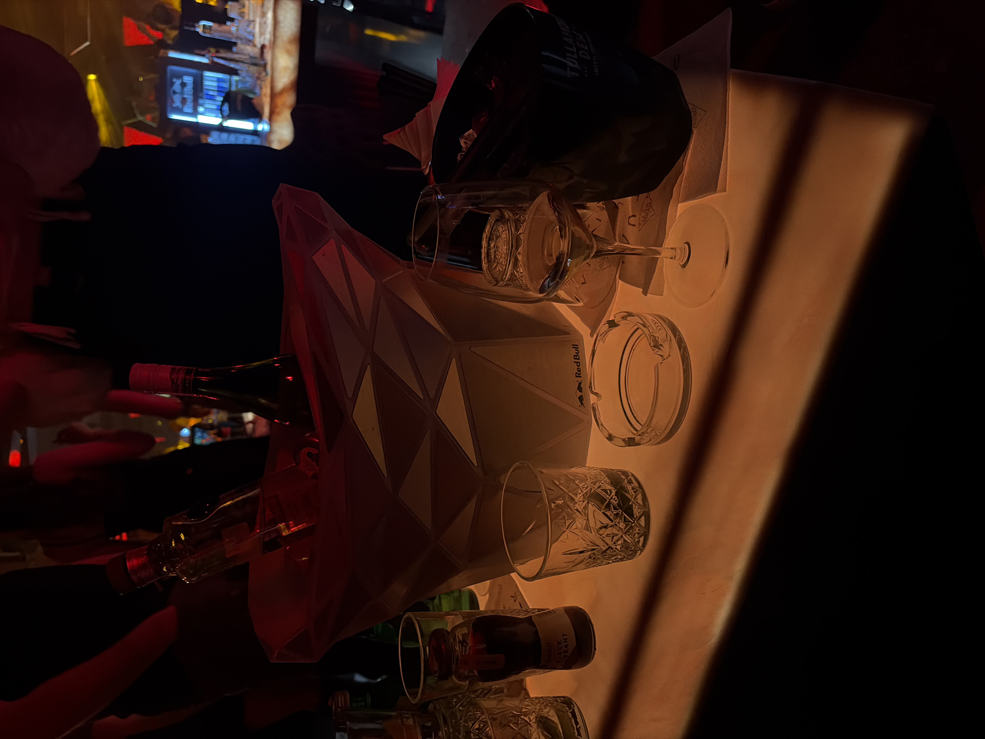 The image depicts a dimly lit bar setting, likely in Sofia, Bulgaria. A table is visible, illuminated by a soft, warm light. A black ice bucket, labeled "Tullamore D.E.W.", sits near the edge, partially obscuring a wine glass. Nearby, there is an empty ashtray. A geometric ice bucket and some bottles of alcohol are to the left of the ice bucket. A man's arm is visible in the lower left corner, suggesting someone is seated at the table. The bar seems to be bustling with activity, and a screen is showing images of the bar.