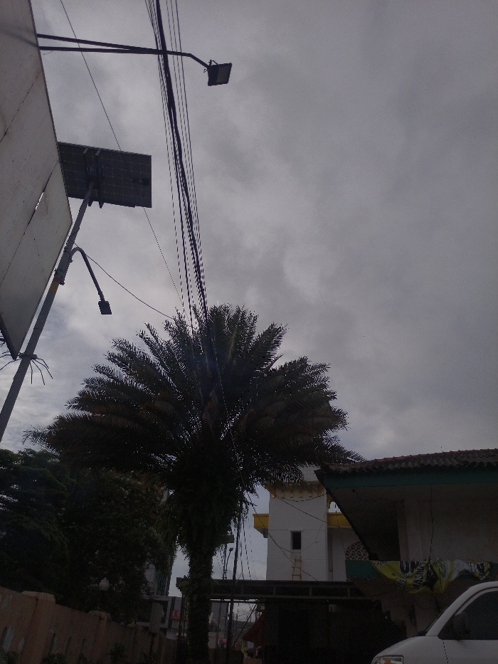 The photograph captures a cloudy day, showcasing a palm tree in the foreground. Electrical wires and a street lamp are visible overhead, contrasting with the overcast sky. Behind the tree, a white building with a yellow accent and a ladder leaning against it emerges. Part of a roof with green trim and a white car are also visible on the right side of the image.