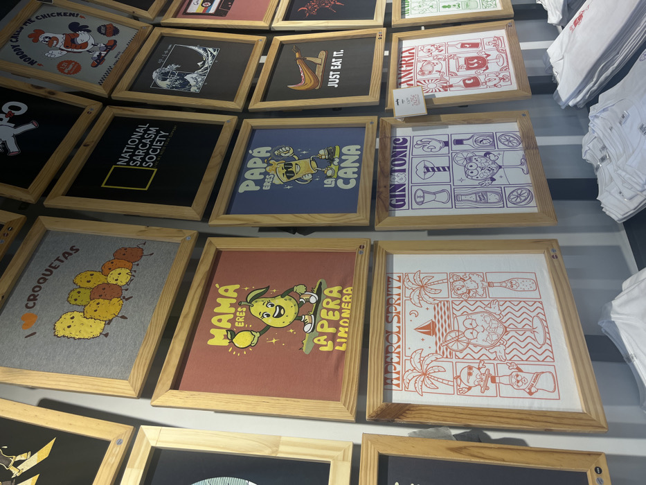 collection of framed, graphic t-shirts hanging on a wall. The shirts feature diverse designs including cartoon characters, food-related illustrations like croquetas and fruits, and text-based humor such as "National Sarcasm Society" and "Just Eat It." Some shirts display drink-themed graphics like Gin & Tonic and Aperol Spritz. The frames are wooden, and the shirts appear to be part of a retail display.