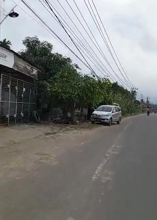 gray van parked on the side of a two-lane road in an area with a mix of residential and commercial buildings, lots of wires overhead, and greenery. The camera is moving along the road, passing the parked van. There are other vehicles, including motorcycles, visible in the distance. The sky is overcast. The road appears to be in fair condition with some wear. There is a dirt shoulder to the left of the road, and vegetation is present along the roadside. A small wooden structure with an advertisement is visible to the left of the parked van.