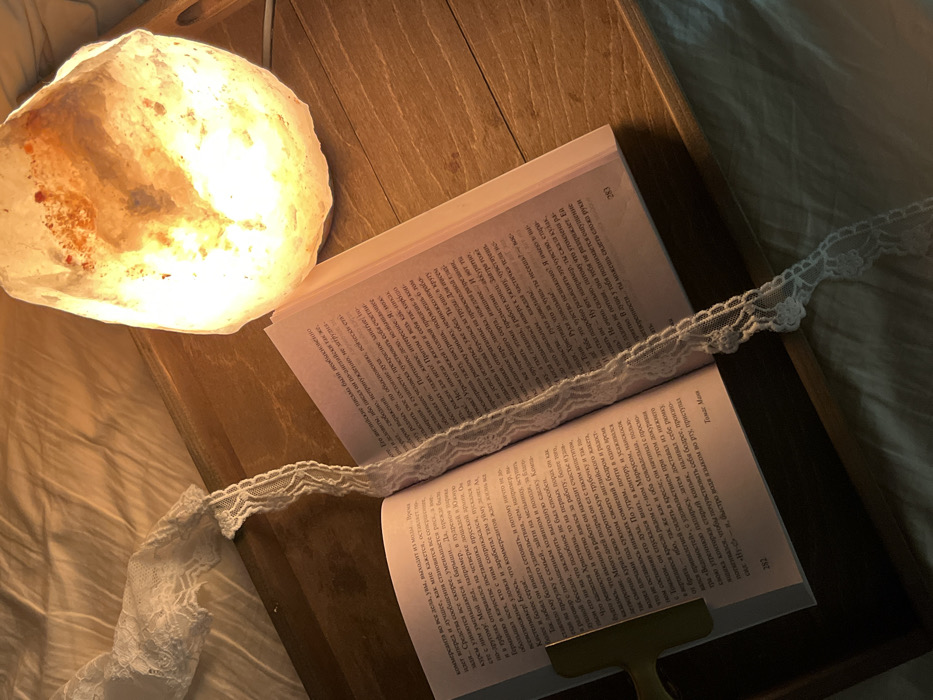 An open book rests on a wooden tray, illuminated by a warm, glowing salt lamp nearby