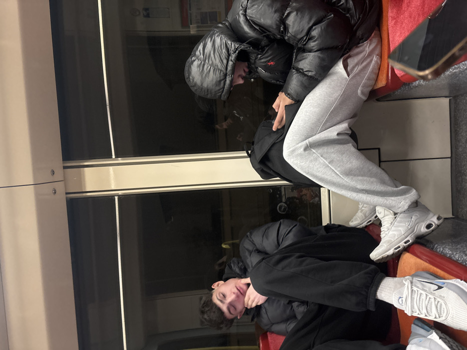 Two people in puffy jackets and sweatpants sit in a train or bus. One wears black, the other gray. Both wear sneakers. The person in black sits lower, resting their chin in their hand. The person in gray sits higher, leaning forward towards the window. A black backpack is nestled between them. The train car is visible through the window. The interior is mostly cream-colored with red-orange seats. Part of a phone is visible in the upper right corner.
